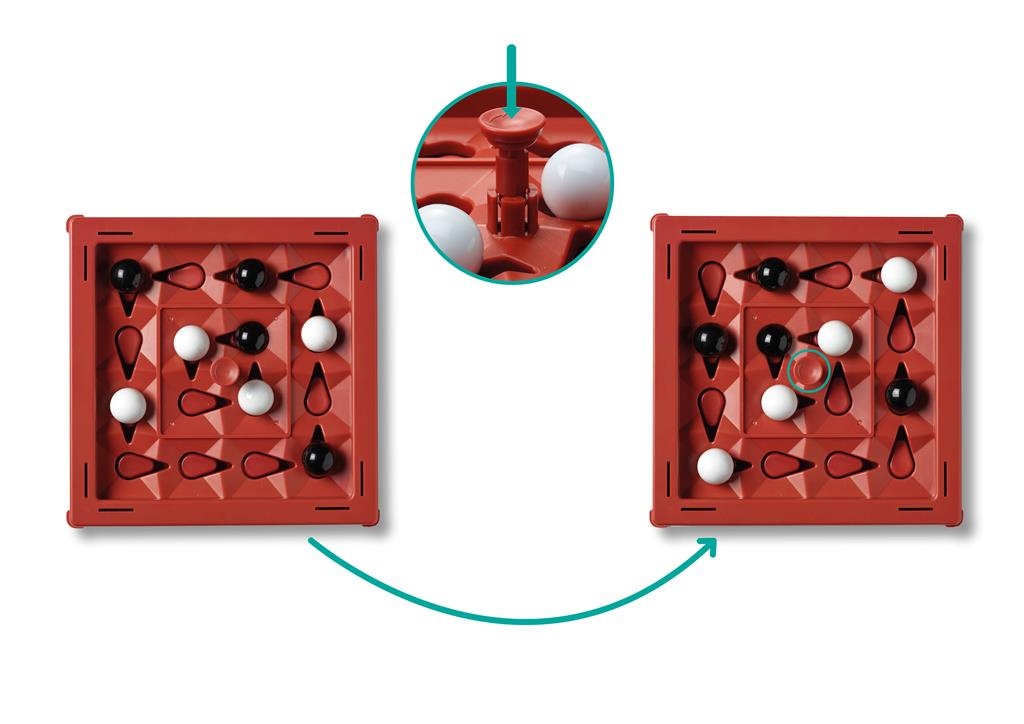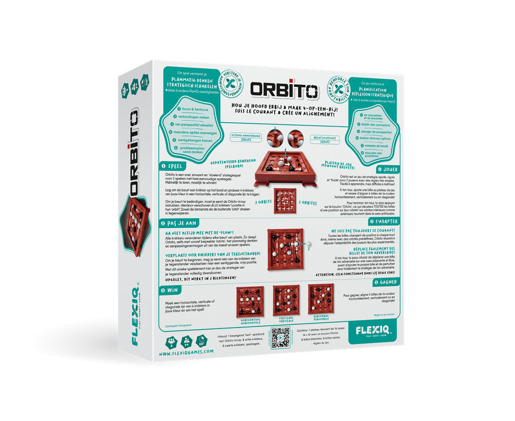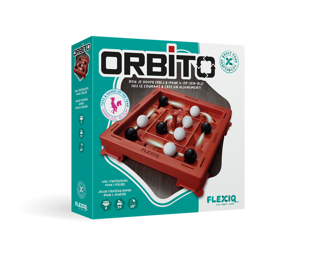Speel: Probeer 4 knikkers van jouw kleur in een horizontale, verticale of diagonale lijn te krijgen op het gepatenteerde, bewegende spelbord. Maar let op! Om je beurt te beëindigen, moet je de Orbito-knop indrukken. Hierdoor verschuive