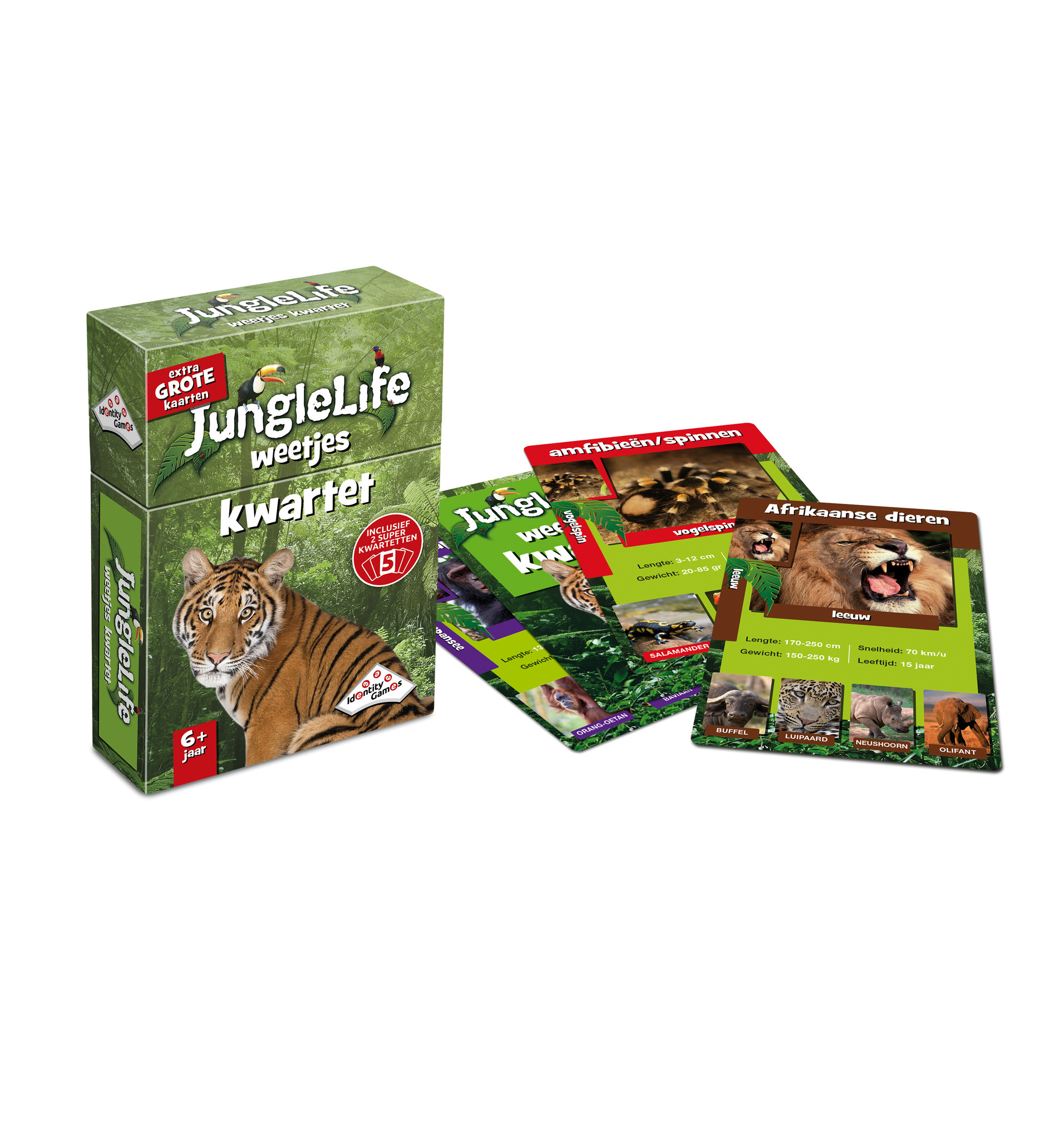 Hoe oud kan een Orang- Oetang worden? Hoe hard kan een Toekan vliegen? De kaarten met fantastische foto’s zijn stevig en geplastificeerd, waardoor ze zeer duurzaam zijn. Het spel bevat ook nog weetjes en bijzondere kwartetten om het spel uit te breiden