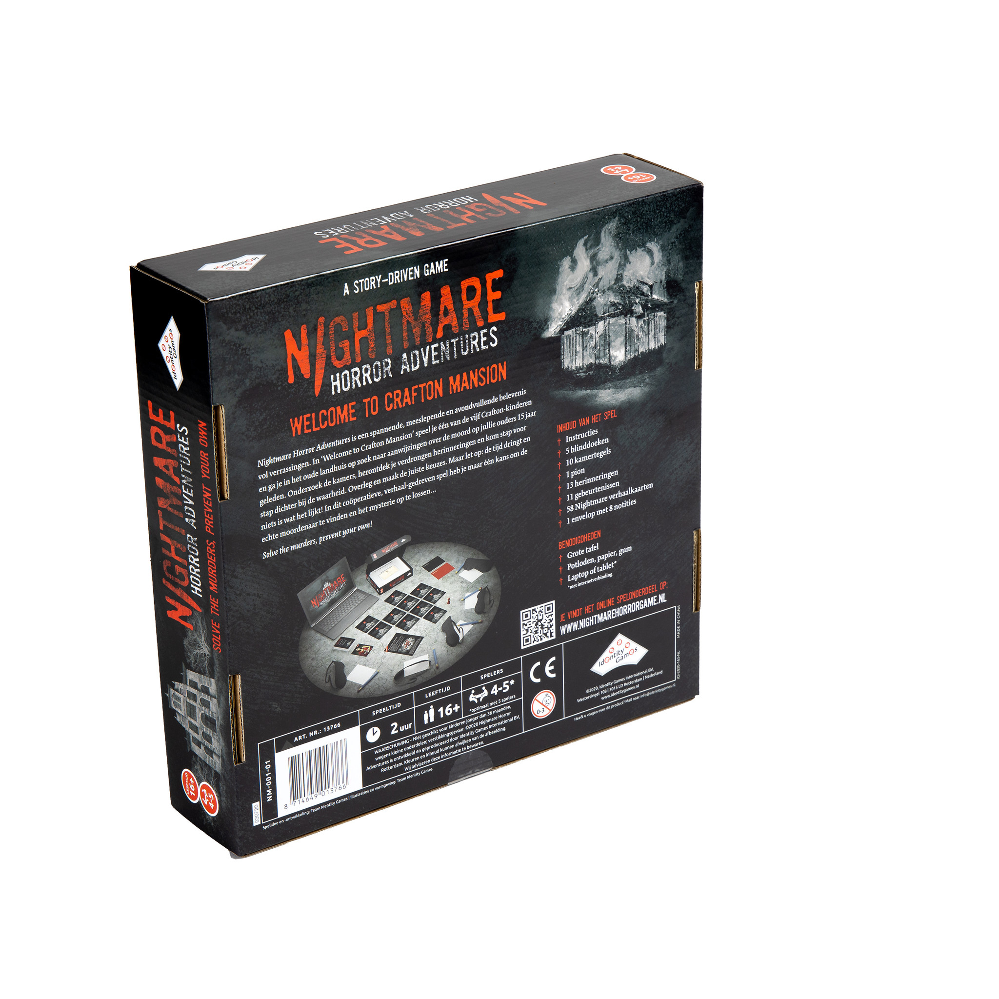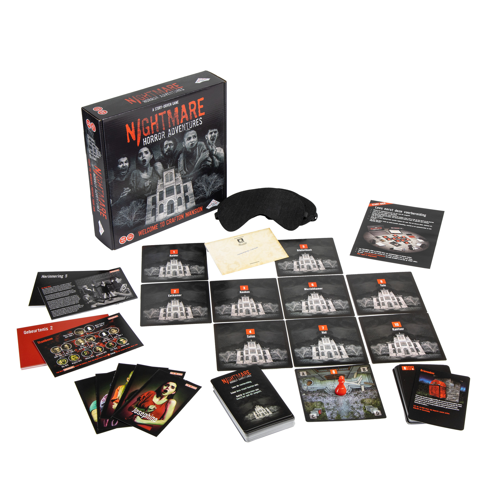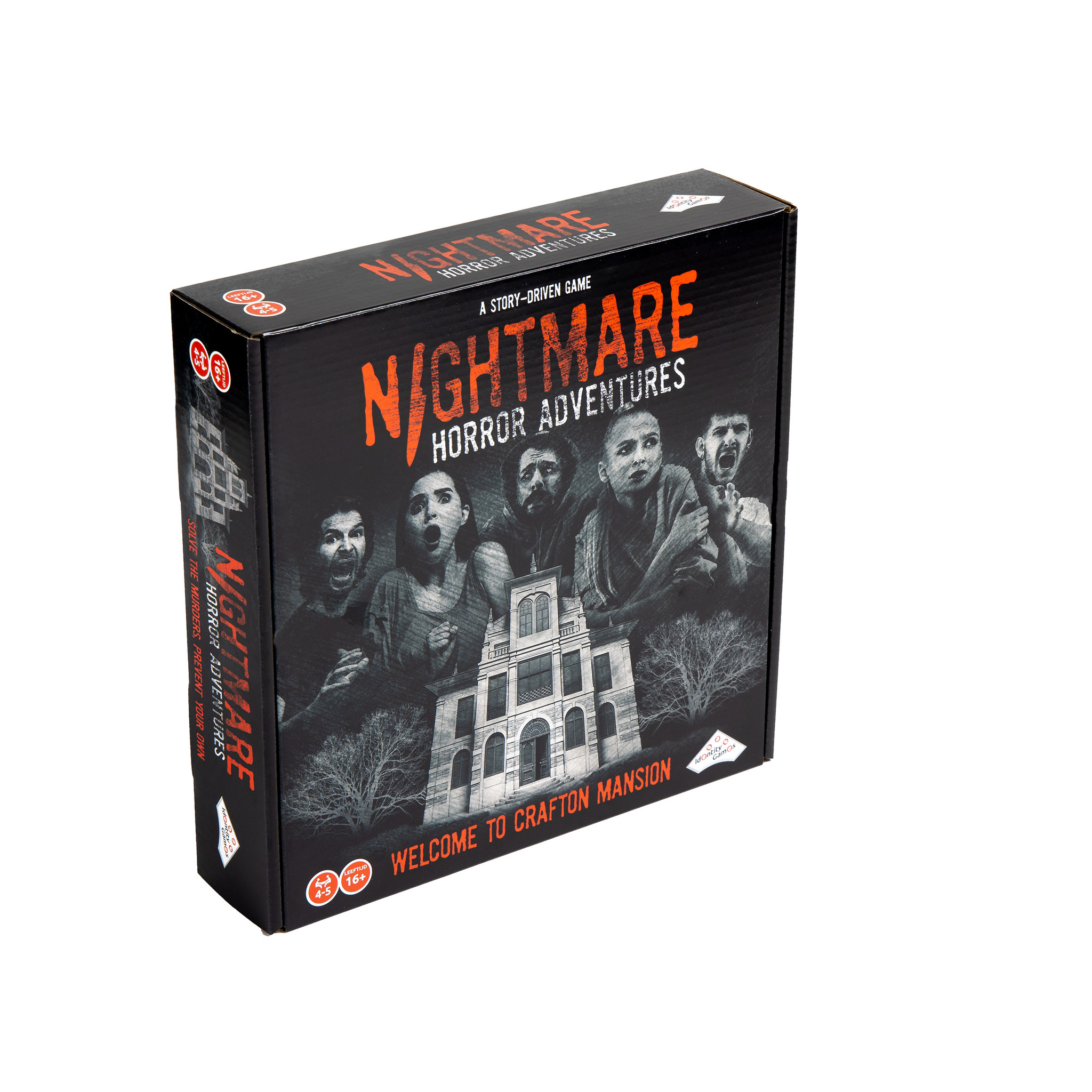 Nightmare Horror Adventures is een spannende, meeslepende en avondvullende belevenis vol verrassingen. In ‘Welcome to Crafton Mansion’ speel je één van de vijf Crafton-kinderen en ga je in het oude landhuis op zoek naar aanwijzingen over de moord op jullie ouders 15 jaar geleden. Onderzoek de kamers, herontdek je verdrongen herinneringen en kom stap voor stap dichter bij de waarheid. Overleg en maak de juiste keuzes. Maar let op: de tijd dringt en niets is wat het lijkt! In dit coöperatieve, verhaal-gedreven spel heb je maar één kans om de echte moordenaar te vinden en het mysterie op te lossen… Solve the murders, prevent your own!