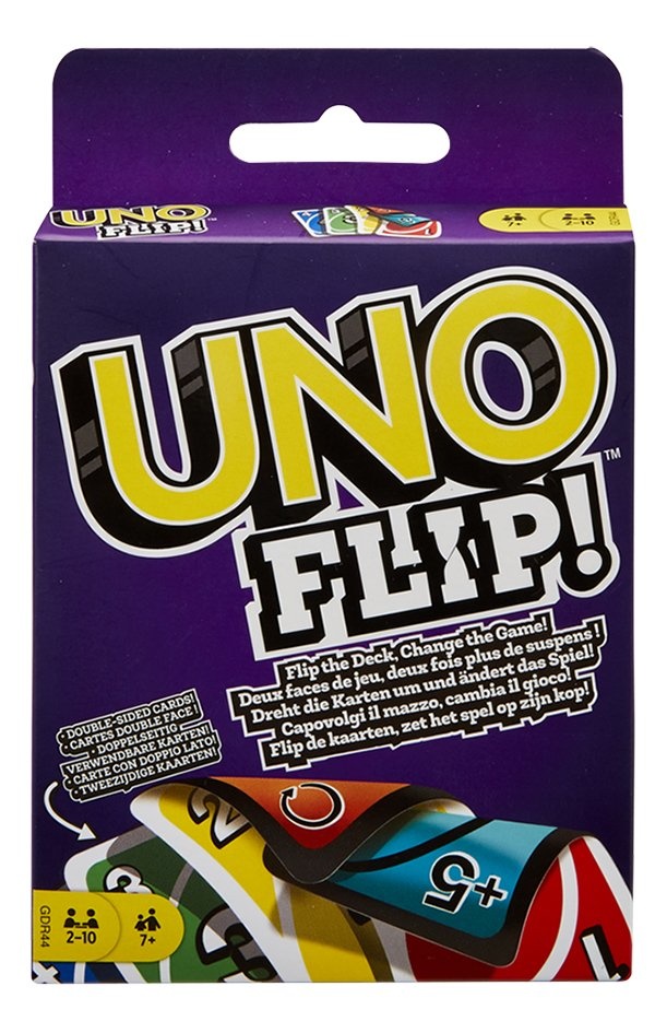De kaarten hebben een ‘lichte kant’ waarmee je het klassieke UNO™ kunt spelen, en een ‘donkere kant’ waarbij de straffen superstreng zijn. Speel de FLIP-kaart en alle kaarten in je hand, de pakstapel en de andere kaarten worden omgekeerd en je ziet een