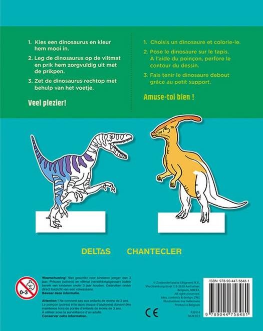 Laat je kind een van de kleurplaten van de dino’s uitkiezen en inkleuren. Leg daarna de kleurplaat op de viltmat en gebruik de prikpen om gaatjes te prikken langs de stippellijnen. Duw ten slotte de tekening uit en zet ze rechtop met behulp van het voe