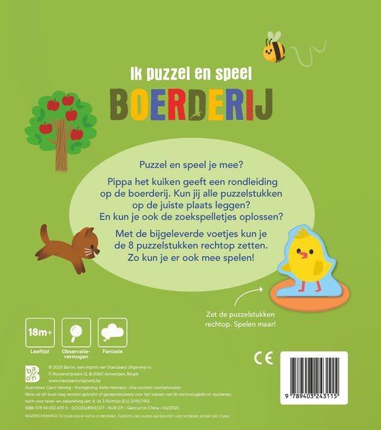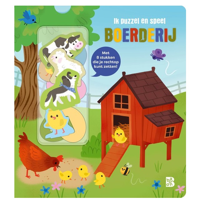 In dit puzzelboek leren de allerkleinsten puzzelen. Lees het verhaaltje voor en laat je peuter de puzzelstukken op de juiste plaats leggen. Je kunt de 8 puzzelstukken ook rechtop zetten met de bijgeleverde voetjes. Zo kun je er ook mee spelen!
