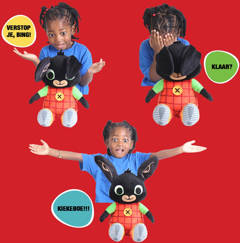 Kijk jij ook altijd naar de avonturen van BING en zijn vriendjes? Speel nu met deze schattige, pratende Kiekeboe Bing! Bing wil graag met jou een spelletje spelen. Knijp in zijn hand en zijn oren zullen zijn ogen bedekken, terwijl hij verschillende zinnen zegt! Als je het niet verwacht gaan zijn oren weer omhoog: Kiekeboe!!! Kleine Bingsters zullen het geweldig vinden om de oren op en neer te zien gaan! Met deze pratende Kiekeboe Bing zul je je nooit vervelen!