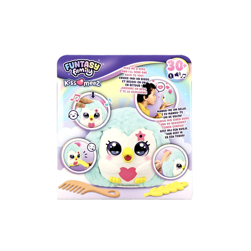 Ontdek de Kiss – Meez Uil, een lieve interactieve plush knuffel die graag knuffelt en kusjes uitdeelt. Aai haar, geef haar een kusje en luister hoe ze vrolijk reageert met zachte geluiden en gegiechel.Kam haar pluizige veren en geef haar iets lekkers om h
