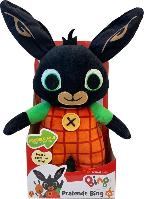 Kijk jij ook altijd naar de avonturen van Bing en zijn vriendjes? Dan ben je vast ook dol op deze Pratende Bing knuffel! Natuurlijk draagt hij zijn stoere rode, geruite tuinbroek met button, net zoals in de animatieserie. Druk op zijn button en hij zal tegen je lachen en praten.
