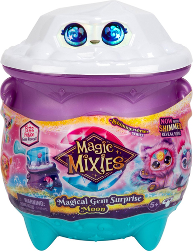 Begin de magie door Bubbel- en Bruisstof in de ketel te strooien. Schrijf de naam van je Mixie Plushie op de naamrol en laat deze erin vallen. Vul vervolgens het schenkflesje met water en voeg dit toe…. de Ketel borrelt en bruist voordat er een magische Edelsteen doos uit de bovenkant van de Ketel springt – WOW! Wanneer je de Edelsteen doos opent, ontdek je 1 van de 2 maanmagische Mixie Plushies met een bijpassende Ring! Ontdek de magie van het maanelement. Druk op de kristallen edelsteen op het voorhoofd van je Magic Mixies Plushie en kantel deze naar voren en naar achteren om het glanseffect in de ogen te zien! Gebruik de Edelsteen doos om je Mixie Plushie of andere persoonlijke bezittingen in op te bergen. Er zijn twee maanmagische Mixie Plushies te verzamelen. Leeftijdsindicatie: 5 jaar+.