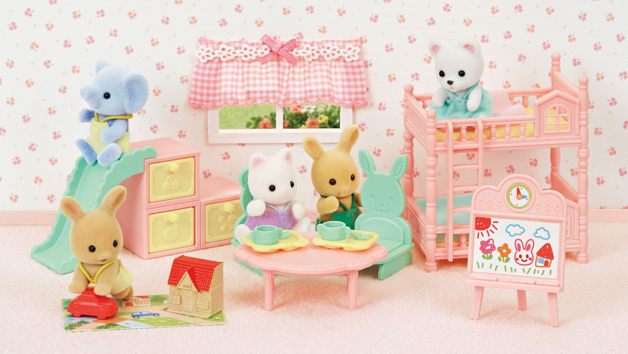 Babykamerset is een schattige kamerset met veel babymeubels en twee babyfiguren, Sunny Rabbit Baby (kruipend) en Polar Bear Baby (zittend). Babykamerset wordt geleverd met Sunny Rabbit Baby (kruipend) en Polar Bear Baby (zittend) , en meubels met een schattig pastelkleurenschema. Het bevat alles wat je nodig hebt om een leuke babykameromgeving te creëren om in te spelen: slapen in bed, eten, tekenen of spelen op de glijbaan.