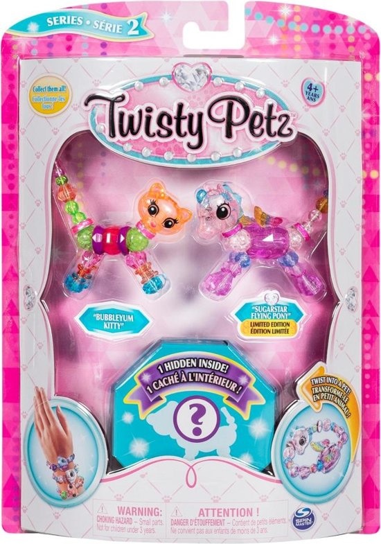 Verzamel ze allemaal en voeg metallic, regenboog, pastel en zelfs parelmoer en flow in the dark armbanden aan je collectie toe. Met een eenvoudige draai komt je schattige huisdier tot leven! Om te transformeren in een armband kun je jouw diertje gewoon uit elkaar trekken en de uiteinden met elkaar verbinden. Om een ketting te maken, verbind je 3 stuks met elkaar! Deze set vol edelstenen bevat drie Twisty Petz: 1 is zelfs verborgen als een verrassing!