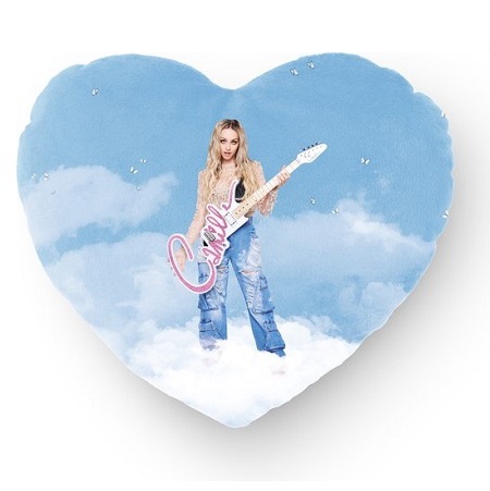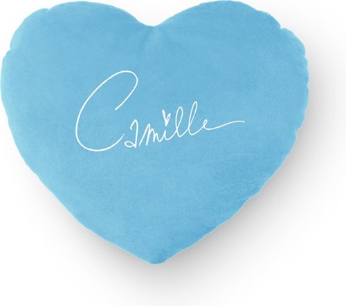Ultrazacht 40x40cm blauw sierkussen in hart vorm met aan de voorkant een foto van Camille en aan de achterkant het logo van Camille.