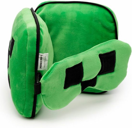 Reiskussen/knuffel en slaapmasker set voor op reis, geschikt voor kinderen. Model: Minecraft Creeper. Een leuk computerspel knuffeltje opbergtasje met rits, wat na het openen een kussen wordt. Wordt geleverd incl. een oogmasker, deze zit vast aan het kuss