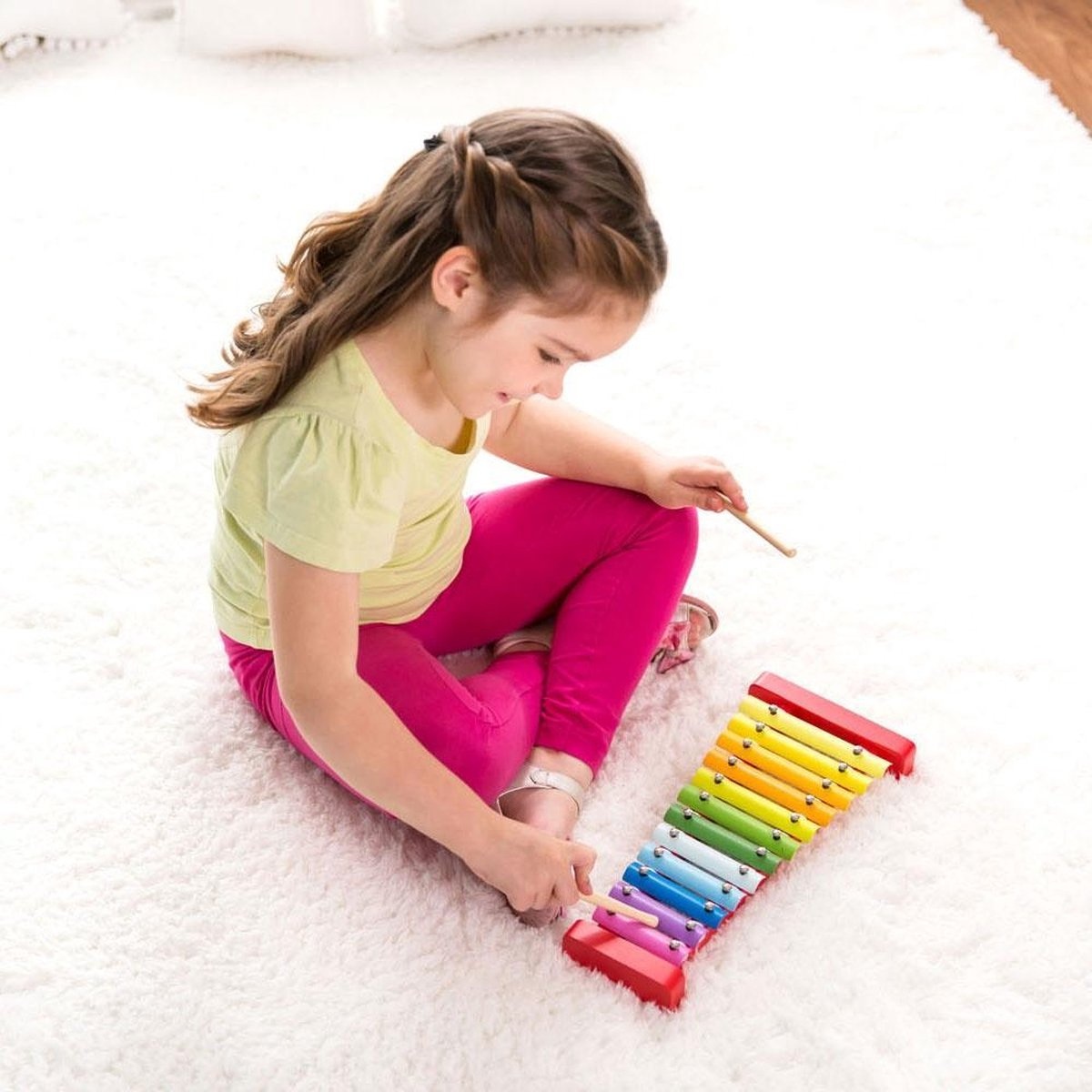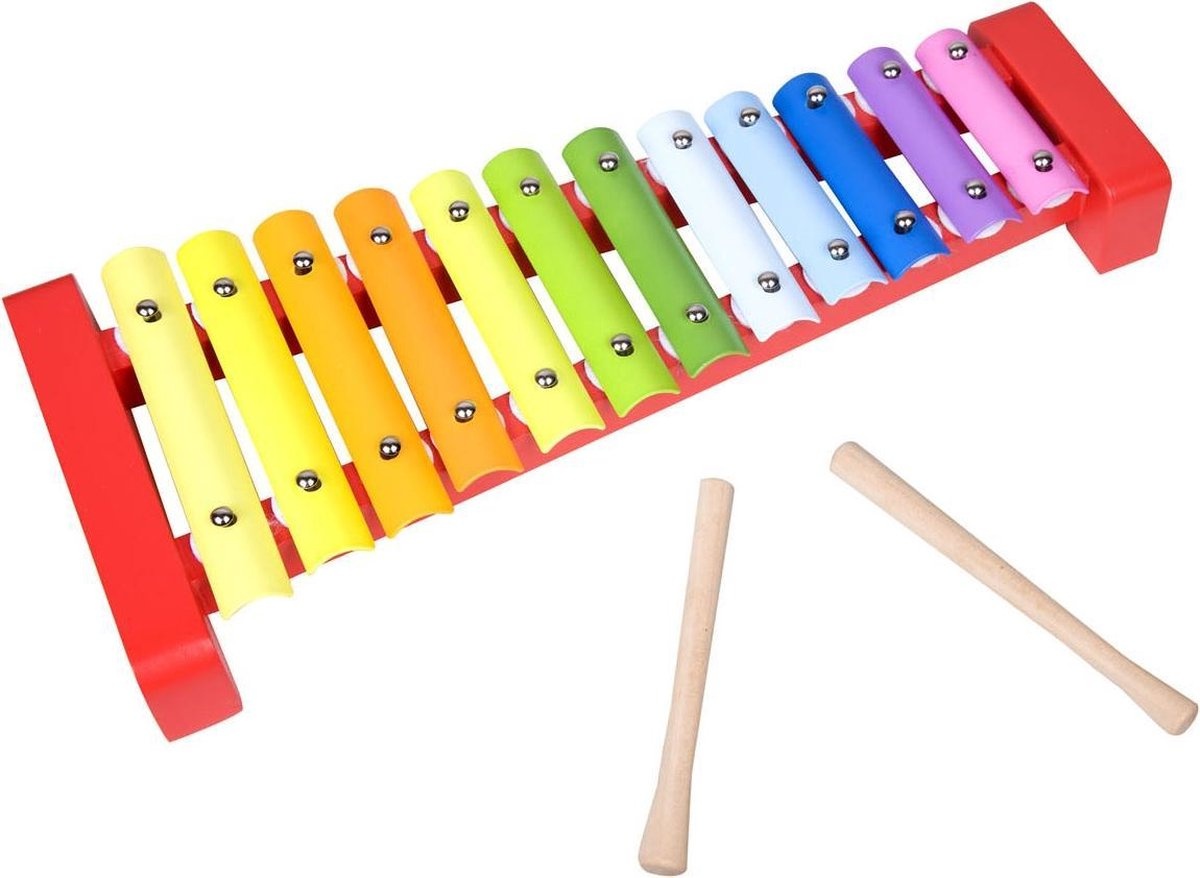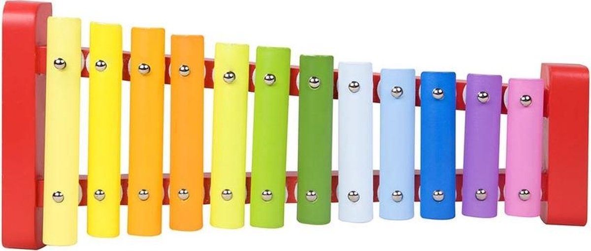Maak de mooiste melodische klanken op deze Classic World Houten Xylofoon Ster. De xylofoon heeft een houten rode frame met 12 klankplaatjes in de kleuren van de regenboog. Inclusief 2 houten stokken.