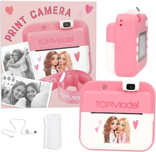 Lachen, printen, genieten! De roze digitale camera van TOPModel met een schattige modellenafbeelding heeft een ingebouwde printer (grijze thermische print). De cameralens kan naar voren of naar achteren gedraaid worden voor een selfiemodus. Foto’s kunnen worden opgeslagen door een 32 GB SD-kaart te plaatsen (niet inbegrepen).