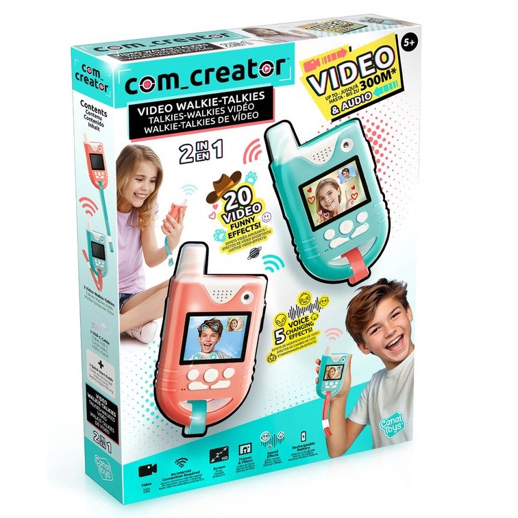 Speel geheime missies of blijf in contact met je bestie! Deze video walkie talkies zorgen voor beeld én geluid, helemaal draadloos. Met een bereik van 3 km bieden deze apparaten leuke videogesprekken met filters en stemgeluidseffecten. Inclusief oplaadbare batterij.