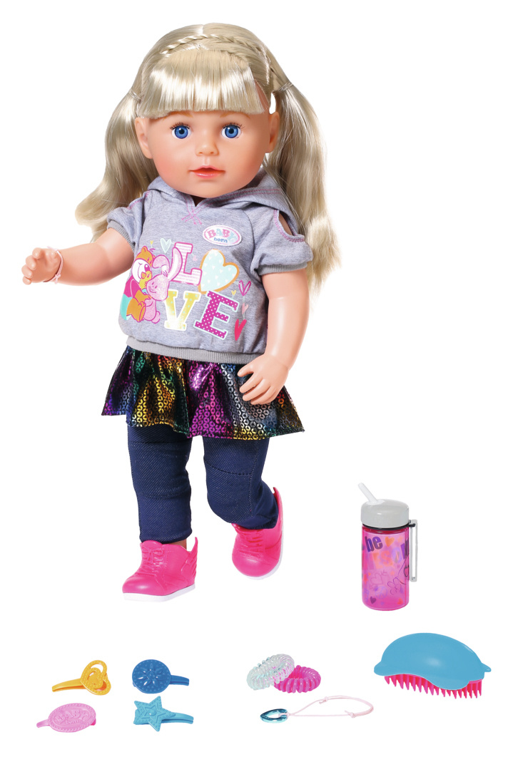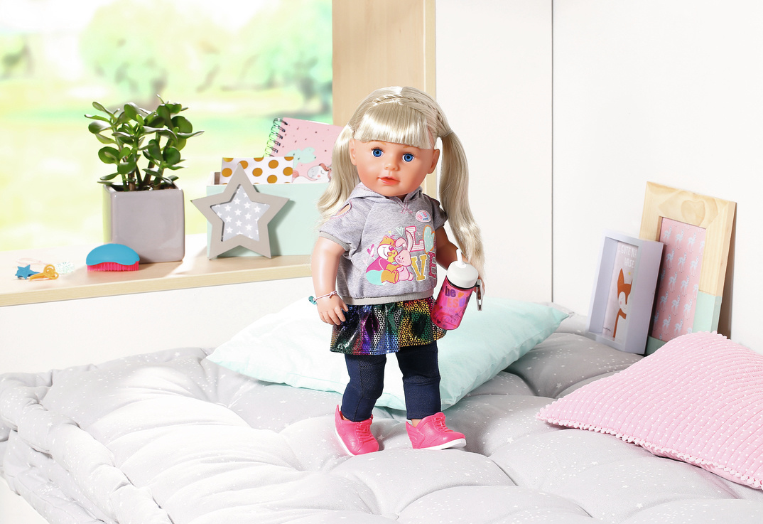 BABY born, dat is mijn glittertop!” Als het om kleren met glitters gaat, lijkt het niet alleen maar rozengeur en maneschijn te zijn tussen de zussen. Maar dat lijkt maar zo, want de twee delen alles. Haar zus mag dan een stukje ouder zijn dan BABY born, ze hebben dezelfde maat, zodat ze makkelijk kleding en accessoires met elkaar kunnen ruilen. Het meisje met het lange blonde haar draagt een shirt met capuchon, met daaraan bevestigd een rok met lovertjes. Eronder draagt ze een eenvoudige legging in jeanslook. Roze sneakers maken het geheel af. De pop met Soft Touch-lijfje heeft extreem flexibele knieën en kan al zelfstandig staan. Ze spettert graag samen met BABY born in het water, daarvoor maakt ze haar haar vast met een borstel, de elastiekjes en haarclips. Haar flesje heeft ze altijd bij zich bij het zwembad. Zo veel badderplezier! Maar soms trappelt BABY born te hard met haar beentjes en spettert ze haar zus te veel nat, waardoor haar zusje in tranen uitbarst. – BABY born Sister – Met zes levensechte functies voor nog meer plezier – Afwisselend (rollen) spel met BABY born stimuleert de verbeelding en is een bewezen ondersteuning van sociale vaardigheden zoals verantwoordelijkheid, communicatie en empathie – Geen batterijen vereist BABY born Soft Touch Sister – blond (43 cm) met shirt, legging en schoenen. Inclusief flesje, borstel, 2 spiraalvormige elastiekjes, 4 haarclips en 1 vriendschapsarmband voor zowel het kind als de pop. Het blonde zusje met zes functies heeft tien accessoires bij zich.