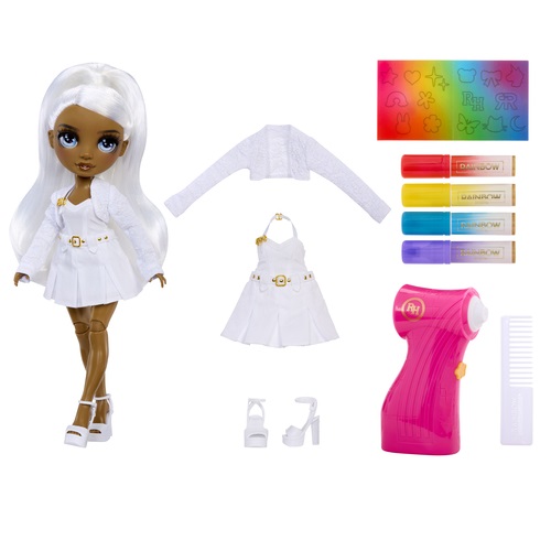 Het is Rainbow High’s missie om kleurrijk en creatief zelfvertrouwen te stimuleren… en nu kun je je eigen visie tot leven brengen met de gloednieuwe Airbrush & Create-modepop om zelf te ontwerpen! Het is nog nooit zo makkelijk geweest om je eigen Rainbow High-pop te ontwerpen. Er zit een AIRBRUSHSET bij, inclusief airbrush, afwasbare regenboogmarkers, volledig in het wit geklede modepop met wit haar. Steek gewoon een afwasbare regenboogmarker in de airbrush, sproei en kijk hoe de magie zich ontvouwt! Kleur het haar, de outfits en zelfs de schoenen. Wil je preciezer werken? Gebruik de marker dan rechtstreeks op de outfit voor meer gedetailleerde ontwerpen. Uitwassen en herhalen. Maak steeds weer een nieuw ontwerp. Als je klaar bent met het ontwerpen van je pop, kun je er eindeloos mee spelen.