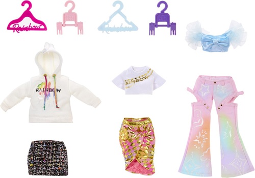 RAINBOW-KAST-SPEELSET. Inclusief must-have exclusieve pop, kledingrek, kledinghangers, kleding, planken voor meerdere niveaus, schoenen en tasjes.