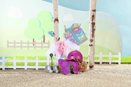 Voor een dag in de manege heeft de kleine paardrij-ster de juiste outfit nodig: een paardenshirt met lange mouwen, een bodywarmer om warm te blijven tijdens de rit, een paardrijbroek en rijlaarzen om veilig in het zadel te blijven zitten. Natuurlijk is een geschikte helm een must. Ook aan het paard van BABY born is gedacht: accessoires zoals een zweepje en een roskam voor het borstelen zijn ook inbegrepen. De outfit past ook BABY born Sister en andere poppen van 43 cm.
