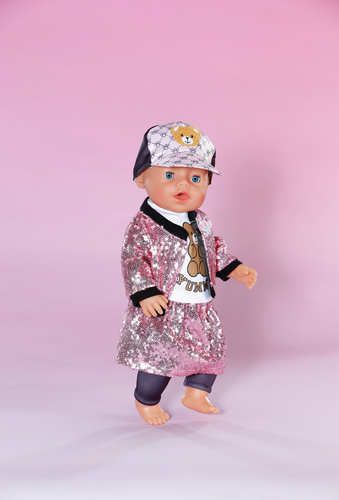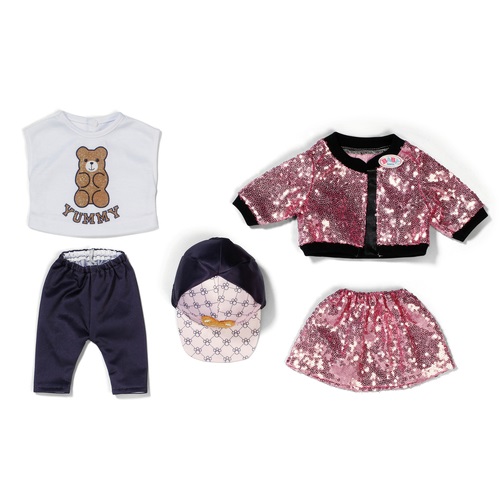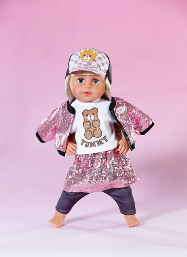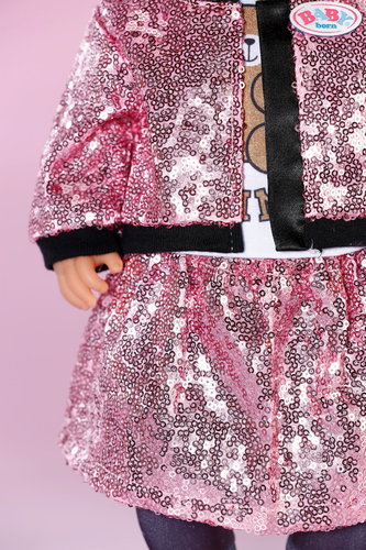 Met deze 5-delige glamouroutfit glinstert BABY born als een echte ster! Inbegrepen bij deze set zijn een glanzende legging en een glittershirt, plus een rok en een jack in collegestijl, allebei met roze lovertjes. De coole pet met berenapplicatie maakt de