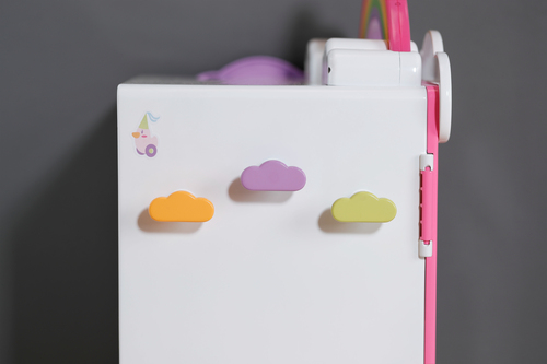 Bewegen is superleuk met de BABY born Regenboogkledingkast! Terwijl je Berta de eend over de regenboog duwt, licht ze op. Berta speelt een vrolijke melodie af waardoor ze vanzelf in een goed humeur komt terwijl ze haar outfit voor vandaag kiest. Dankzij de kledingstang, planken en verwijderbare laden is er genoeg ruimte voor poppenkleding. Tassen of vergelijkbare items kun je aan de schattige wolkenhaken hangen aan de buitenkant van de kast. Je kunt de hele outfit van BABY born bewonderen in de grote spiegel. De kledingkast kan nog kleurrijker gemaakt worden met het stickervel.