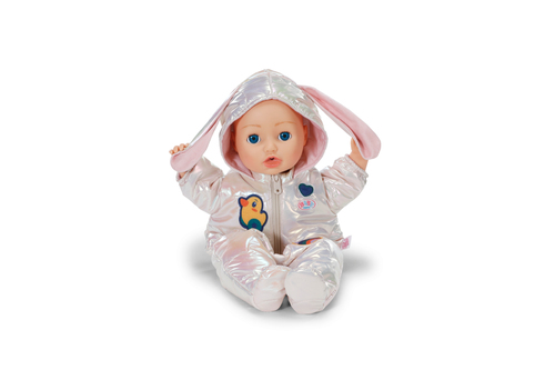 Dit skipak voor poppen van 43 cm is perfect voor koude dagen! BABY born glijdt superstijlvol de pistes af in deze crèmekleurige, metallic look met schattige konijnenoren op de capuchon.