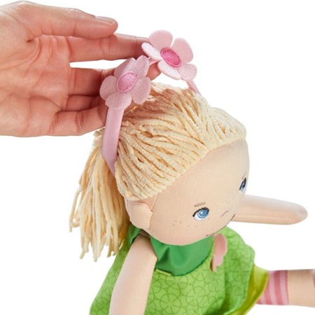 Vrolijke lappenpop met zeer leuke outfit. Mali heeft een schattige, mooie haarband in die bestaat uit zacht roze bloemen. De lappenpop draagt een zomerse, groene jurk met daaronder een korte legging. Net als haar kleertjes, kunnen ook haar roze schoentjes