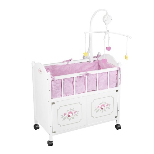 Houten poppenbed met kast (2-deuren) en mobieltje – wit (49x37x35cm)