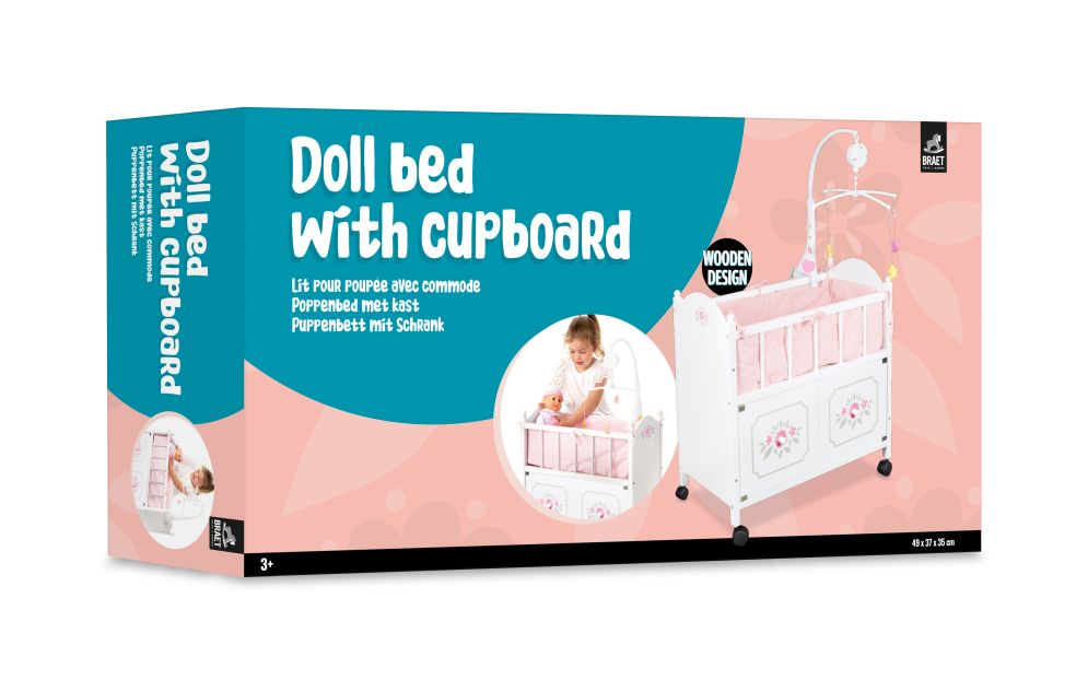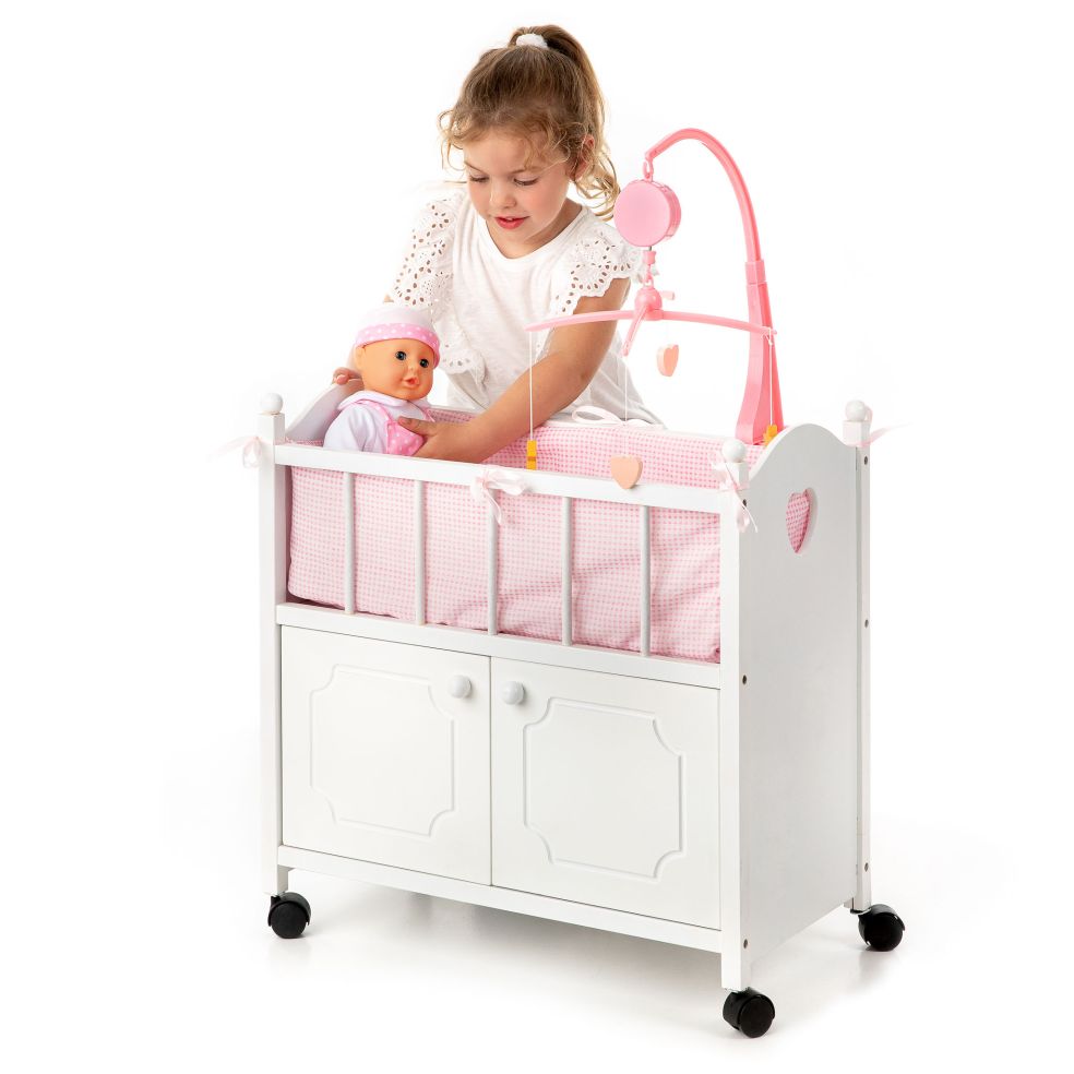 Wit bedje met commode zo kan je alle spulletjes die je nodig hebt om je popjes luier te verversen in deze commode opbergen. Met roze mobiel.
