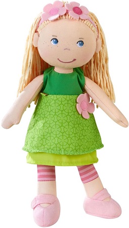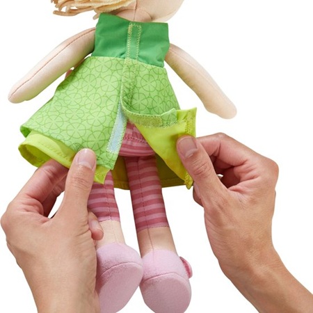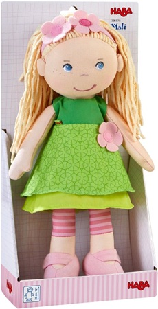 Vrolijke lappenpop met zeer leuke outfit. Mali heeft een schattige, mooie haarband in die bestaat uit zacht roze bloemen. De lappenpop draagt een zomerse, groene jurk met daaronder een korte legging. Net als haar kleertjes, kunnen ook haar roze schoentjes uit. Haar blonde haren en blauwe ogen passen zeer goed bij haar kleding. Mali is een prachtige lappenpop voor het kind dat graag zelfstandig speelt. Materiaal: gewatteerd lichaam, haar van chenille, kleren in katoen/polyester. Lengte: 30 cm.