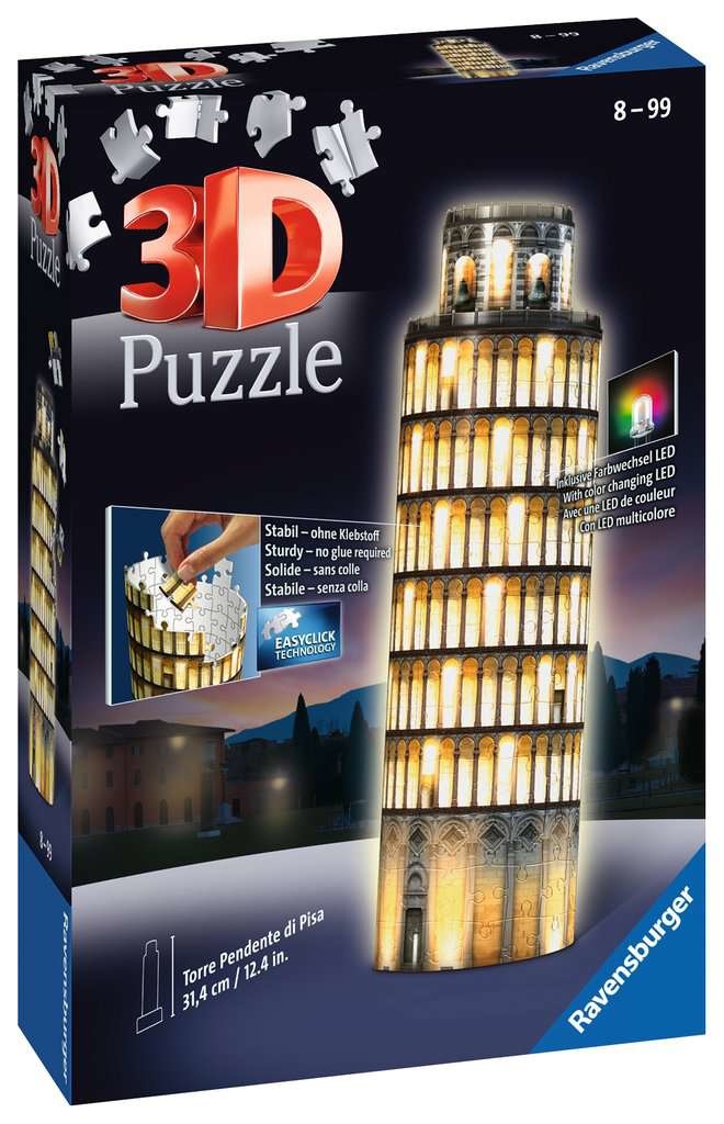 De meeste bezoekers bezichtigen de scheve toren van Pisa overdag, maar bij schemering is hij pas echt schitterend: sfeervol verlicht, wordt het ca. 55 m hoge bouwwerk in de prachtige ambiance van de Piazza dei Miracoli na het invallen van de duisternis een romantische highlight. Uniek drie dimensionaal puzzelplezier, dat zijn de 3D puzzels van Ravensburger!