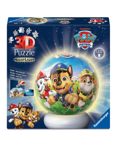 De nieuwste missie van de Paw Patrol: een bedtijdmaatje worden! De 3D Puzzle bal met Chase, Skye en vrienden verandert in een nachtlampje op zijn verlichte voet en waakt betrouwbaar over de dromen van kleine helden! De lamp is net zo eenvoudig te gebruiken als een tippelamp. Hij heeft twee helderheidsinstellingen en werkt draadloos op batterijen of via de geïntegreerde USB-C-poort. Het perfecte cadeau voor alle puzzelliefhebbende jongens en meisjes vanaf 6 jaar.