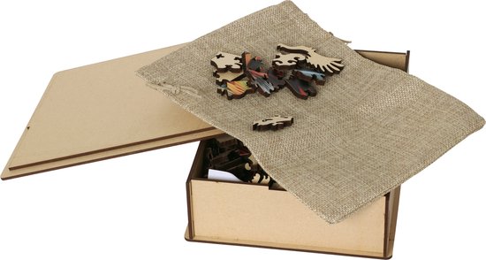 Houten puzzel in MDF-doos met speciale onderdelen.
