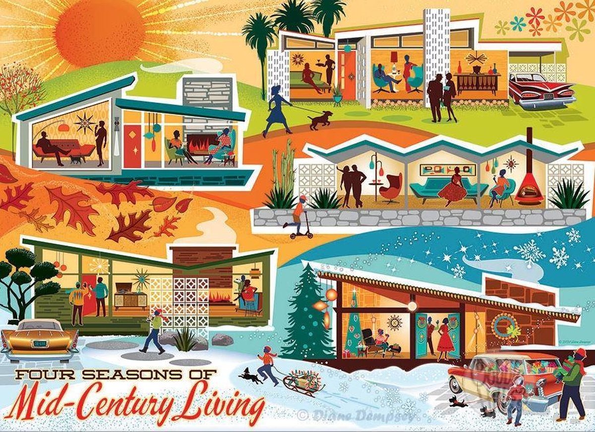 De Four Seasons of Mid-Century Living is kleurrijk geïllustreerd in het feestelijke architecturale ontwerp van Diane Dempsey in deze puzzel van 500 stukjes.