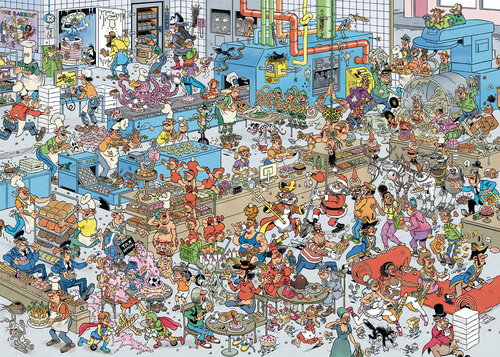 Brood, gebak en koekjes, allemaal specialiteiten van Jan van Haasteren’s Bakkerij. Octo is een ware productiekampioen, en Jan heeft een wel heel slimme manier gevonden om spookkoekjes te maken. Terwijl Sinterklaas en de Kerstman niet op hun beurt kunnen wachten. Deze specialiteiten moeten wel buitengewoon lekker zijn! Een Jan van Haasteren puzzel is meer dan een gewone legpuzzel: het is een avonturenserie, met vertrouwde hoofdrolspelers in een eindeloos decor vol absurde details. Ontdek alle doldwaze avonturen van de Jan van Haasteren – familie! We zijn trots dat onze puzzels zijn gemaakt van gerecycled karton in Europa. Om het karton in puzzelstukjes te snijden, gebruiken we het dunste mes dat er is. De puzzel ziet er bijna naadloos uit als hij klaar is. Geniet van deze Jan van Haasteren – puzzel!