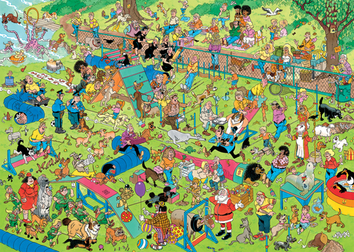 De Jan van Haasteren familie is gek op honden en iedereen leeft zich uit op dit parcours! Het afleggen van de verschillende hindernissen met sprongen, tunnels en loopbruggen is overigens niet voor elke deelnemer weggelegd….. Octo test de behendigheid van de honden op zijn eigen manier. En de kat zorgt voor een flinke chaos! Een Jan van Haasteren puzzel is meer dan een gewone legpuzzel: het is een avonturenserie, met vertrouwde hoofdrolspelers in een eindeloos decor vol absurde details. Ontdek alle doldwaze avonturen van de Jan van Haasteren – familie! We zijn trots dat onze puzzels zijn gemaakt van gerecycled karton in Europa. Om het karton in puzzelstukjes te snijden, gebruiken we het dunste mes dat er is. De puzzel ziet er bijna naadloos uit als hij klaar is. Geniet van deze Jan van Haasteren – puzzel!