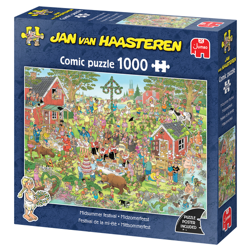 De Jan van Haasteren familie is op vakantie in Scandinavië en bezoekt het Midzomer festival en ervaart de magie van de langste dag van het jaar. Een band speelt traditionele muziek, er wordt gedanst en de meiboom is opgetuigd. Schoonmoeder is te vinden bij de tafel vol met lekkers, maar een boze eland loopt langs. Zal dit wel goedgaan? Een Jan van Haasteren puzzel is meer dan een gewone legpuzzel: het is een avonturenserie, met vertrouwde hoofdrolspelers in een eindeloos decor vol absurde details. Ontdek alle doldwaze avonturen van de Jan van Haasteren – familie! We zijn trots dat onze puzzels zijn gemaakt van gerecycled karton in Europa. Om het karton in puzzelstukjes te snijden, gebruiken we het dunste mes dat er is. De puzzel ziet er bijna naadloos uit als hij klaar is. Geniet van deze Jan van Haasteren – puzzel!