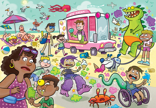 Het is een zinderende zomerdag op het strand en overal bruist het van de pret. Vooral rondom de ijskraam! Wie lust er nou geen heerlijk verkoelend ijsje op zo’n warme dag? Zeker als het ook nog eens gratis is. Maar wacht eens even … zie ik nou spoken of is er hier iets geks aan de hand? De ijsverkoper lijkt bijzonder vrolijk maar er klopt iets niet … Gebruik je fantasie en puzzel wat er komen gaat. Er staat iets heel geks te gebeuren op deze zonnige dag aan zee!