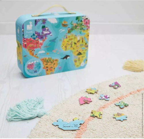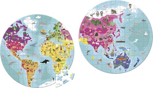 Janod – Puzzel (208stuks) in koffer – De Wereld dubbelzijdig (rond)