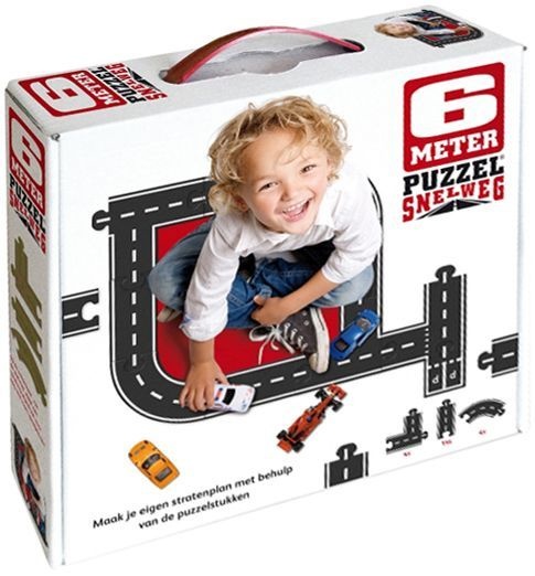 Maak jouw eigen weg van wel 6 meter lang! De stevige puzzelstukken zijn dubbelzijdig. Op de ene kant van de puzzelstukken is een stukje snelweg afgebeeld en op de andere zijde een stukje spoorweg. Scheur dus gauw m