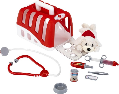 De koffer gemaakt voor kinderen wiens harten kloppen voor dieren: Het bevat niet alleen een charmant, klein pluche hondje dat niet kan wachten om in de harten en armen van kinderen te worden genomen, het bevat ook alles wat nodig is om te helpen als het ziek wordt. Deze praktische veterinaire set bevat ook alle instrumenten die nodig zijn om knuffels en poppen grondig te onderzoeken en hun kwalen te genezen.