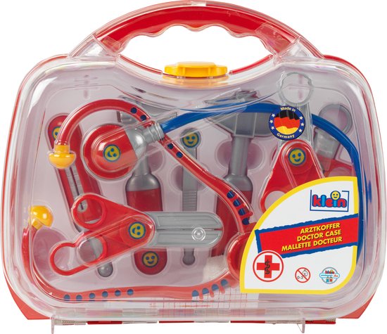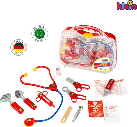 De moderne, transparante dokterskoffer is de perfecte uitrusting voor iedereen die graag knuffels redt en eerste hulp geeft. Met een klinische thermometer, stethoscoop, injectiespuit, oorspiegel en reflexhamer kunnen zieke poppen en knuffels in een handom