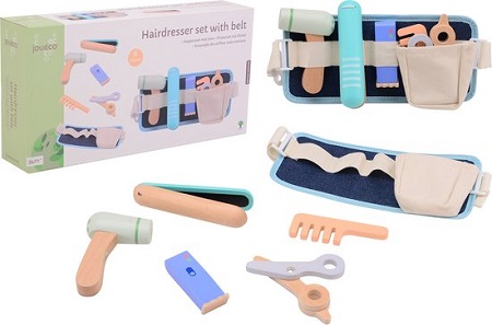 De set bestaat uit een handige riem waar je alle houten kappersaccessoires in kunt bewaren. Zo heb je altijd je föhn, stijltang, tondeuse, schaar en kam bij de hand. Dankzij de stevige materialen en het kleurrijke design is deze set niet alleen leuk, maar ook veilig en duurzaam voor kinderen.