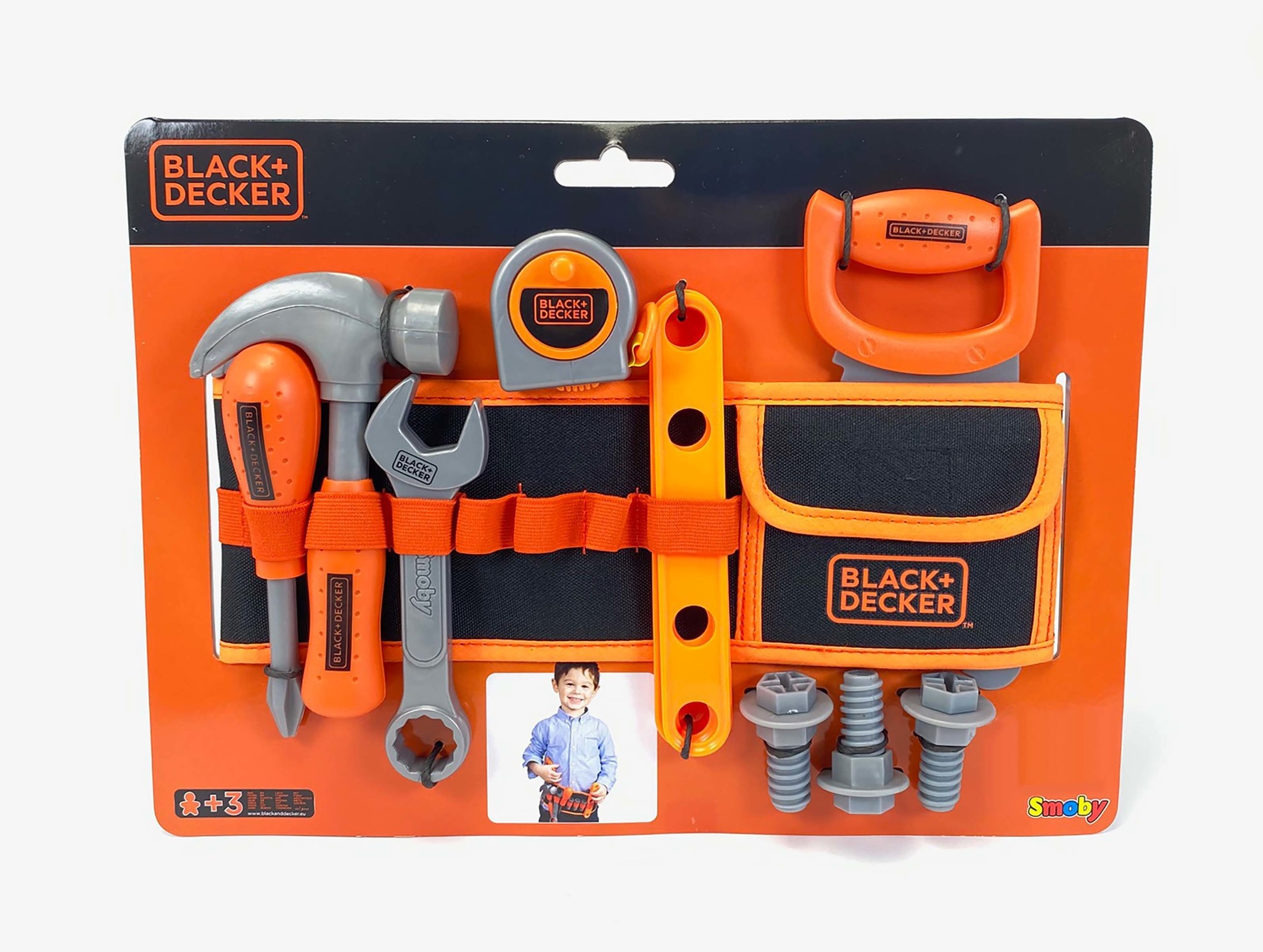 Vervoer al uw gereedschap met uw Black + Decker gereedschapsriem! Je hebt alles wat je nodig hebt om te klussen: 1 zaag, 1 schroevendraaier, 1 hamer, 1 combinatiesleutel, 1 meetlint, 3 schroeven, 3 bouwregels en 3 moeren.