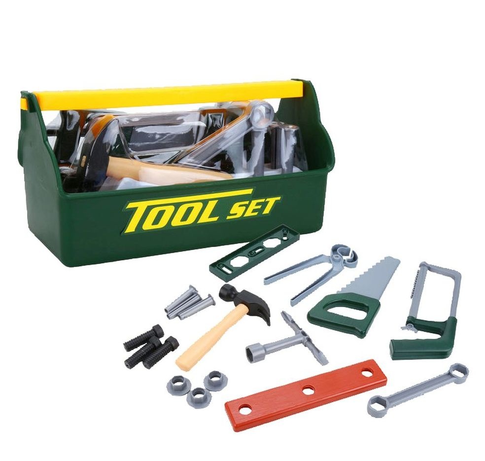 Gereedschapskoffer met verschillende werktuigen, waaronder een hamer, tang, zaag, moeren en een moersleutel.