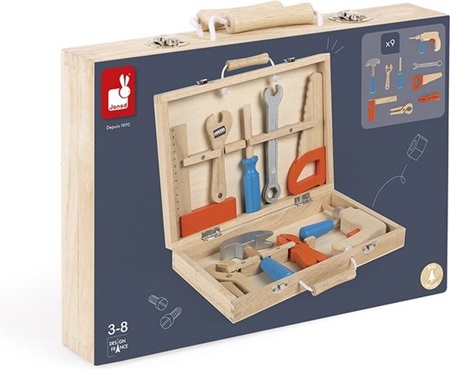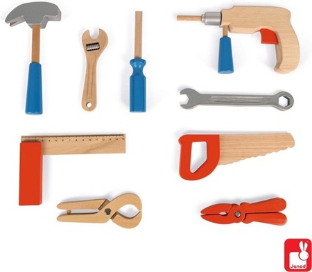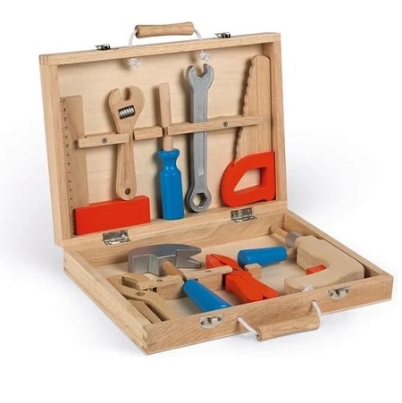 Geef me de moersleutel! Omdat papa en mama af en toe klussen in en om het huis of graag klussen, heb je misschien gemerkt dat je kind je wil nadoen en op zijn eigen manier wil helpen? Deze gereedschapskist bevat alle materialen die je kind nodig heeft om in alle veiligheid te doen wat de volwassenen doen! Deze houten doe-het-zelf-koffer bevat 9 gereedschappen: een hamer, een platte schroevendraaier, een boor, een zaag, een steeksleutel, een moersleutel, een liniaal, 2 tangen. Dankzij de makkelijk mee te nemen koffer kunnen kinderen vanaf 3 jaar dit prachtige gereedschap meenemen naar al hun favoriete bouwplaatsen!