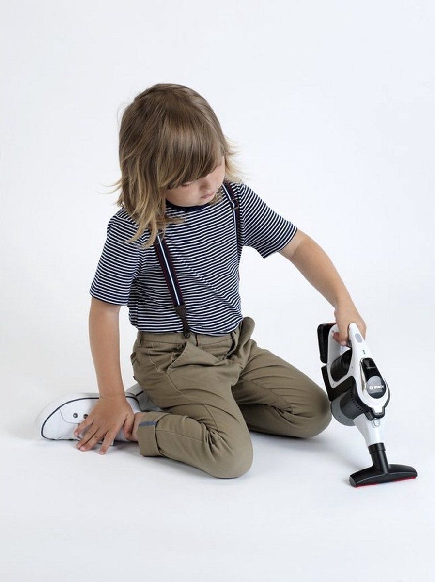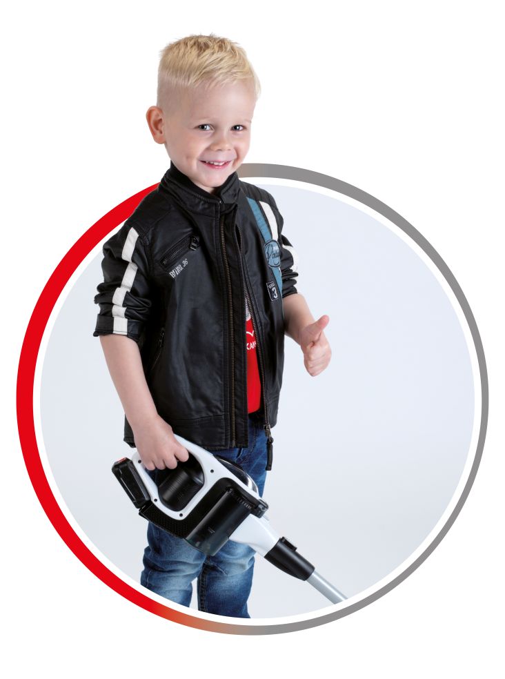 De moderne speelgoedstofzuiger, met draaibare en afneembare zuigmond en looprollen aan de onderzijde, kan de meegeleverde kleine bolletjes opzuigen en in het stofzuigerreservoir rond laten vliegen. Het stofzuigerreservoir is makkelijk te reinigen en te