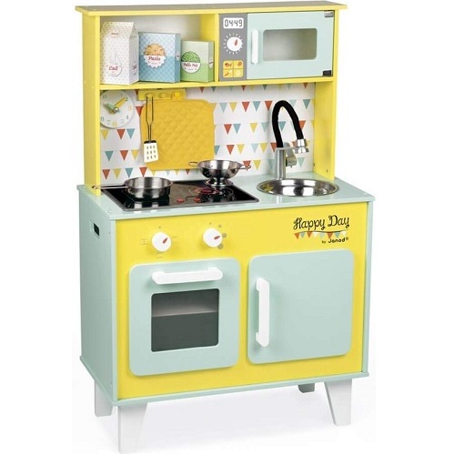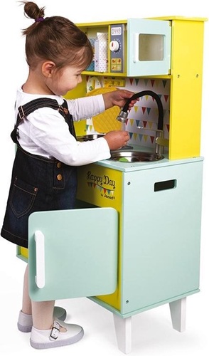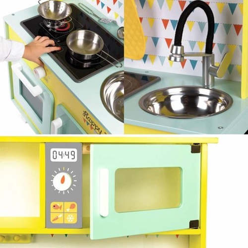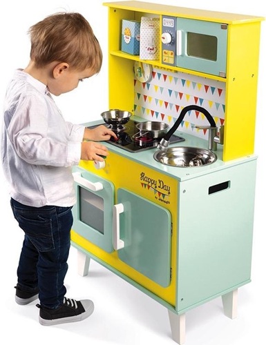 Bereid net zoals papa en mama lekkere kleine gerechten voor je vrienden en word een echte kleine kok!!! Keuken Happy Day, volledig van hout, met haken om een metalen lepel op te hangen, een metalen braadpan, een metalen vergiet, een potholder en 3 kartonnen voedseldozen (pasta, melk en erwten). Het is net zoals een echte keuken voorzien van een inductiekookplaat met geluid en LED-lichten: druk eenmaal op de rode knoppen om de platen aan te steken en druk een tweede keer om het geluid van stromend water te horen. Het geluid en de inductiekookplaten worden automatisch na 30 seconden uitgeschakeld of wanneer u een derde keer op de rode knoppen drukt. Deze prachtige en volledig uitgeruste keuken bevat tevens een oven, een magnetron, een keukenkast en een koelkast met magneetdeuren, 3 draaiknoppen met geluidseffecten, een roestvrijstalen gootsteen en een klok.