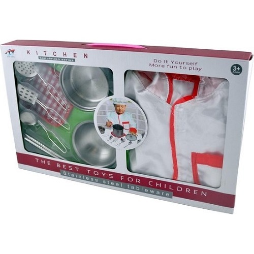 Deze leuke keukenset bevat o.a. een:- kookpot- kom- spatel- pollepel- schuimspaan- schort- pannenlap