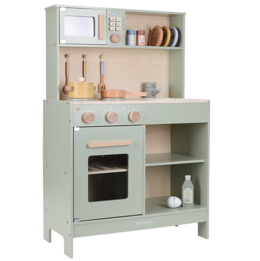 Laat jouw kleine chef de keuken ontdekken met de Little Dutch Houten Keuken Mint! Deze charmante houten keuken in frisse mintkleur nodigt uit tot eindeloos creatief rollenspel. Draai aan de knoppen, roer in de potjes en bak de heerlijkste fantasiegerechten – net zoals in het echt, maar helemaal op kindermaat. Dankzij de stevige houten constructie en veilige afwerking kan je kindje zorgeloos spelen, ontdekken en leren. De vrolijke details en praktische accessoires maken het spel levensecht en stimuleren zowel verbeelding als sociale vaardigheden.