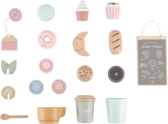 Welkom in de gezelligste koffiehoek! Serveer een heerlijk kopje koffie of thee met een vers broodje of taartje erbij. Met deze prachtige speelgoed koffiecorner kan je kleintje knoppen indrukken, de juiste stand kiezen en een koffiepad plaatsen voor een echte barista-ervaring. De set bevat een koffie- en theeapparaat, een opbergruimte voor kopjes en een kastje om alle lekkernijen mooi uit te stallen. Wie komt er iets lekkers bestellen?
