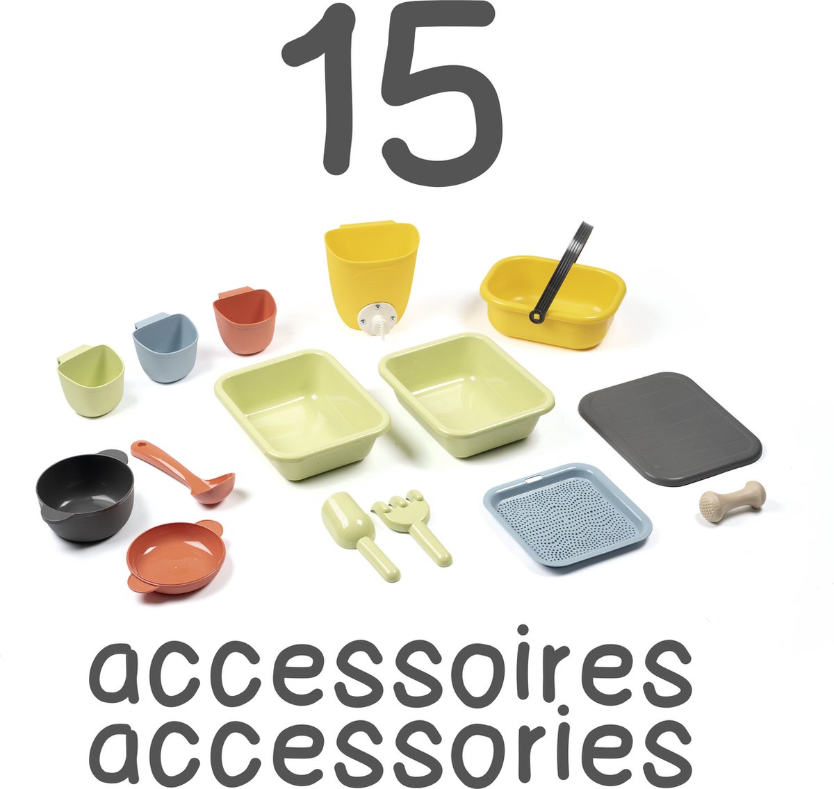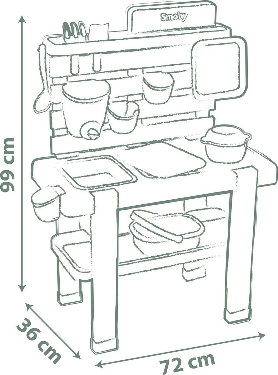 Uitgerust met een anti-UV-behandeling is de patouillekeuken (of “Mud Kitchen”) gemakkelijk schoon te maken en bestand tegen externe omstandigheden. Uitgerust met 11 accessoires, biedt het een realistisc